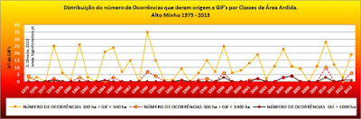 | Gráfico 1 - Distribuição do Nº de GIFs por Ano e Classes de Extensão, 1975 - 2013. Fonte/Dados: ICNF (Clicar na imagem para visualizar) |